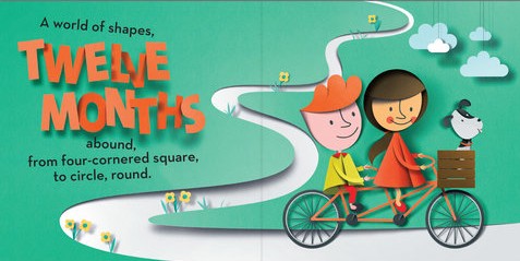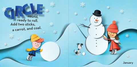 Months and shapes are paired together in Susan B. Katz’s “All Year Round.” Her text is paired with debut illustrator Eiko Ojala’s charming cut-paper artwork. The simple text and colorful illustrations work in harmony. For example: January’s text, “Circle round, ready to roll. Add two sticks, a carrot and coal” is accompanied by an image of two children and a puppy building a snowman.