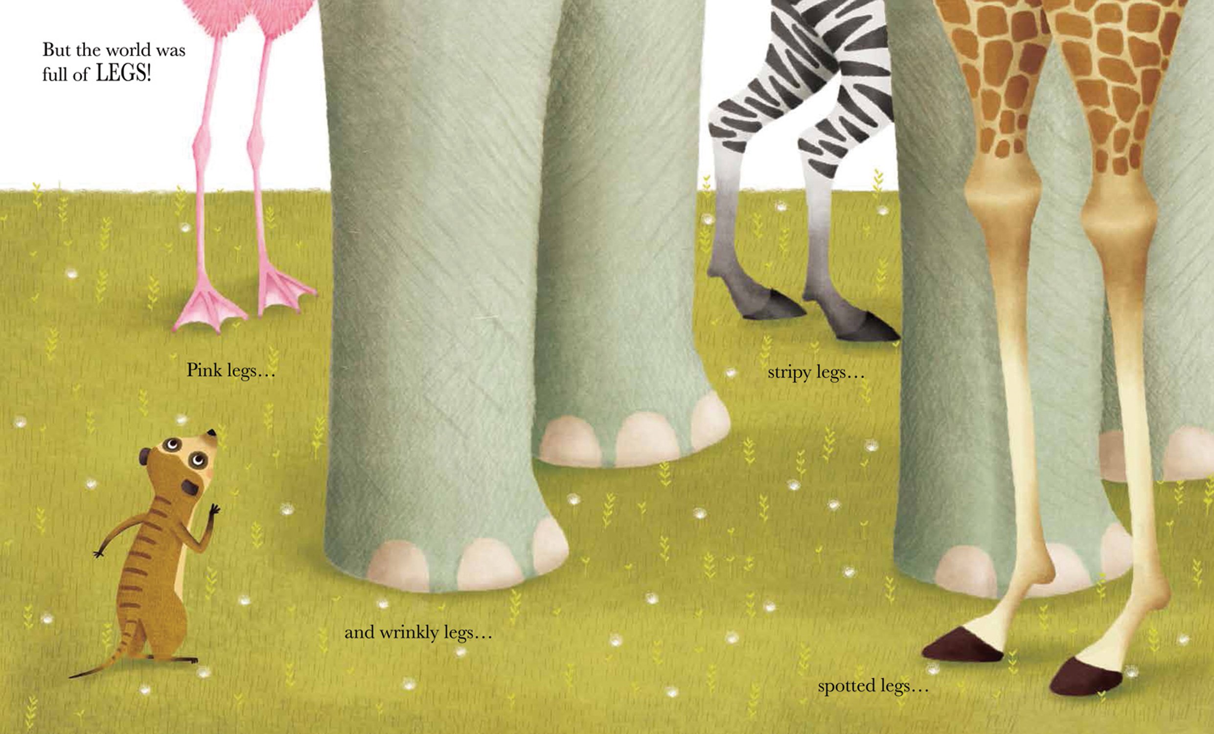 “Legs” looks at the world from a meerkat’s point of view. For Miki, the world consists of pink legs, wrinkly legs, stripy legs and spotted legs. Later, he sees human legs and buildings that look like legs. It’s not until the zookeeper picks him up that he realizes there are faces attached to those legs.