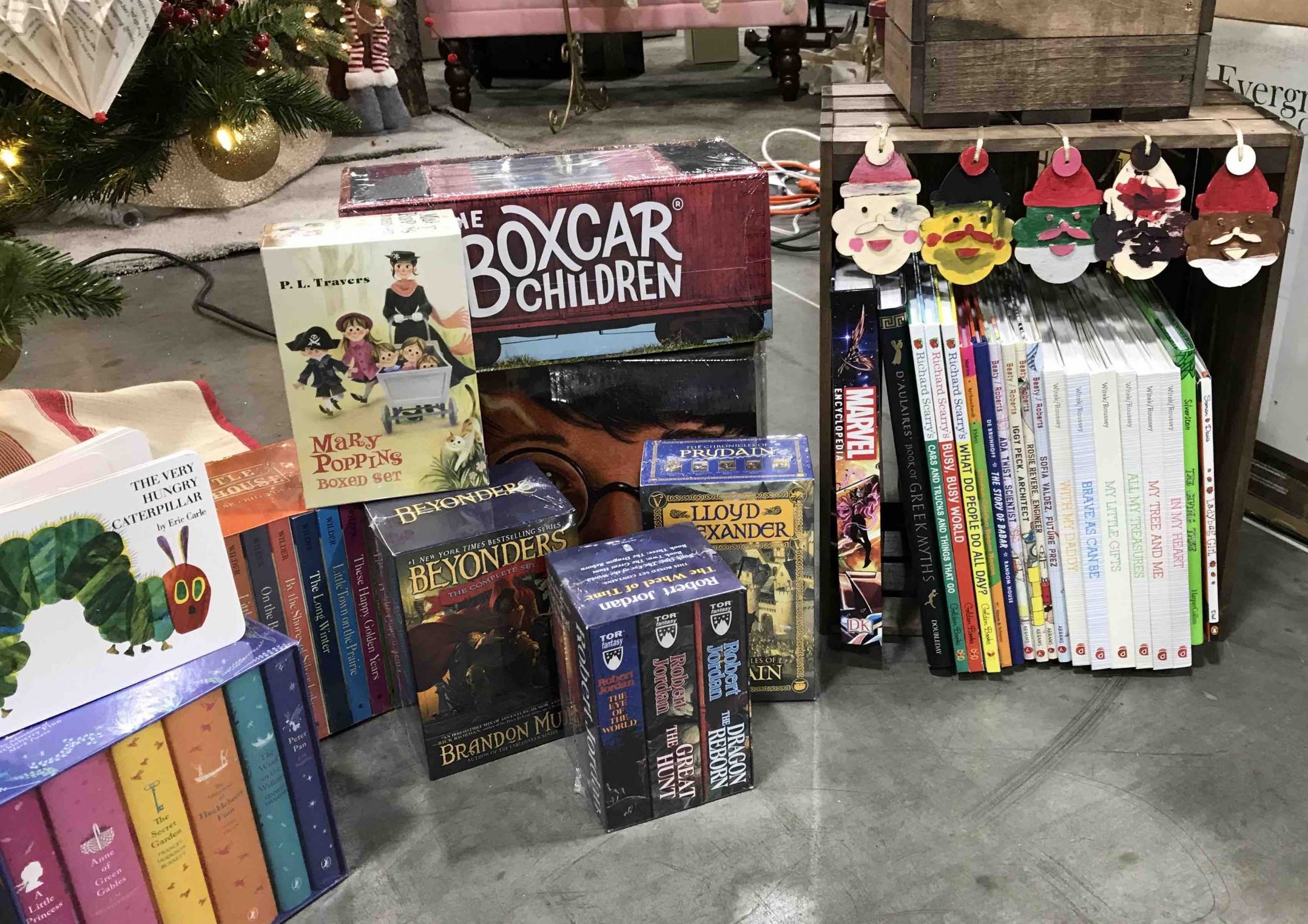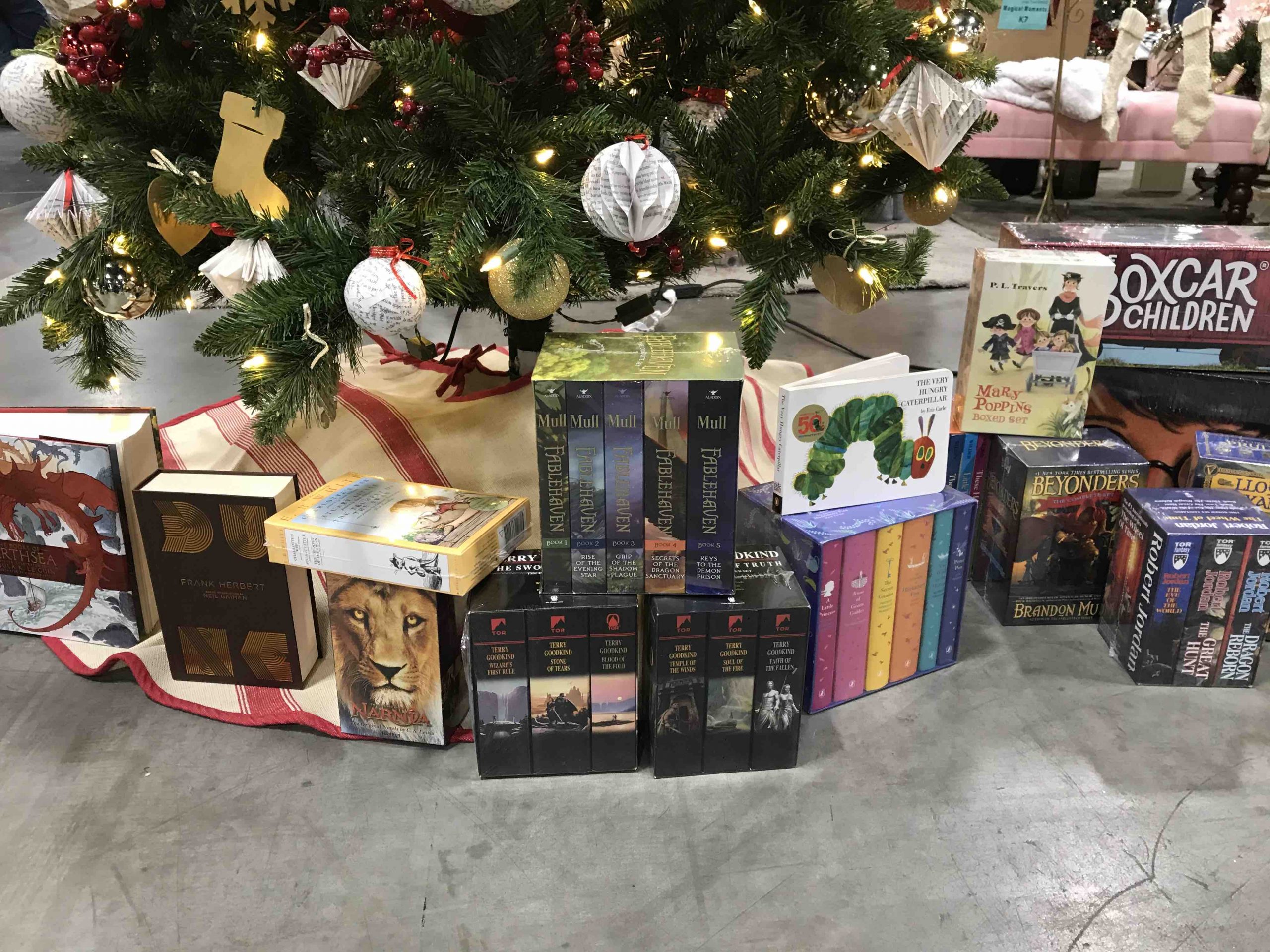 Our tree is decorated with ornaments and a star topper made from the pages of books. Mini books also correspond to $1000 worth of books under the tree. We covered all the bases with the books. They’re all family favorites and cater to all ages.The books range from The Hungry Caterpillar and The Questioneers to The Giver and Encyclopedia Brown to The Princess Academy and Fablehaven to The Chronicles of Prydain and LOTR to Mary Poppins and The Wheel of Time.
