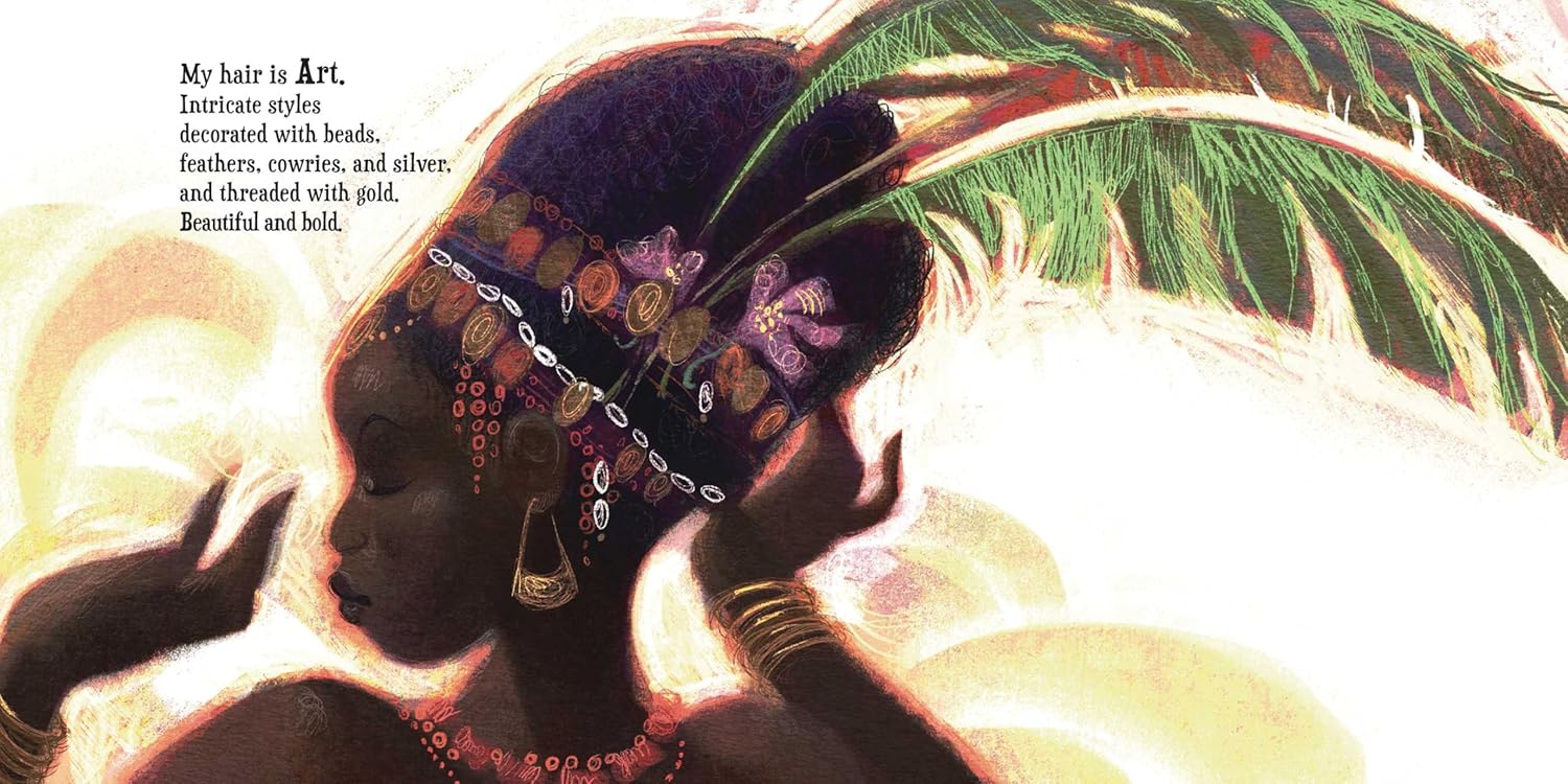With the lushest of language, a young girl getting her hair styled tells an overall history of African hair. Beads. Feathers. Cowries. Threads of gold. Ivory. Charcoal. Pearls. Bantu knots. Cornrows. Goddess Braids. Maps. Seeds. Afros. Clay. Dreadlocks. Woven with the greatest care. Across different African cultures. Everything rich with meaning.