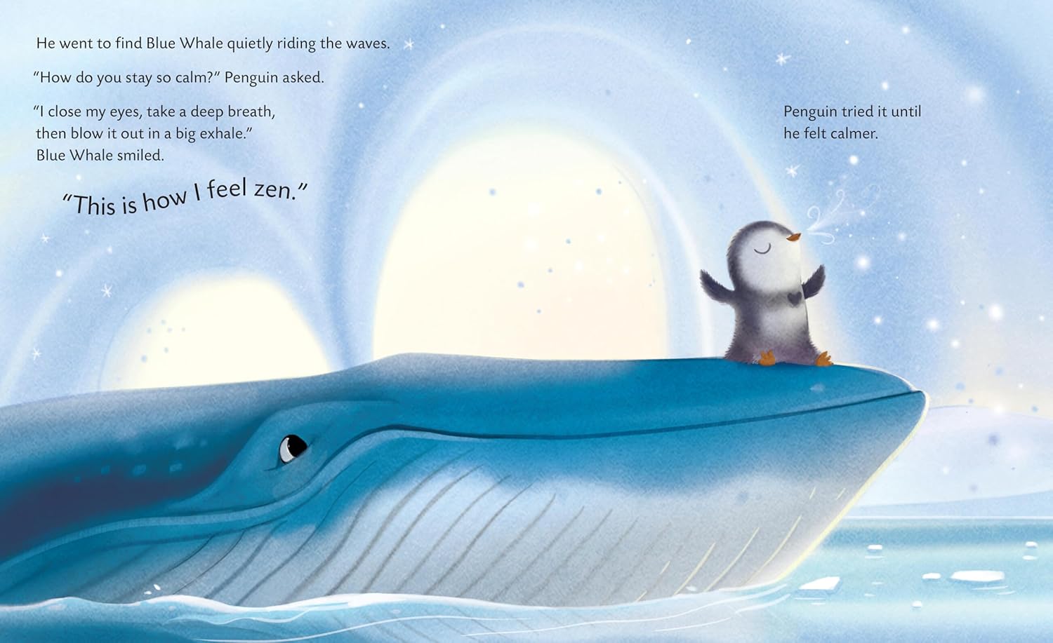 An anxious penguin learns how to find calm when surrounded by big emotions in Zenguin, by Danna Smith and Sydney Hanson.