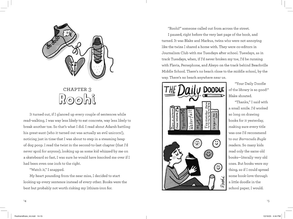Roohi and Nate Are Not on the Same Page unfolds through the alternating first-person viewpoints of Roohi and Nate. Roohi is a great student but struggles in social situations. Nate is the complete opposite. These disparate traits are a strong setup for them to work toward common ground and offer lots of entry points for readers.