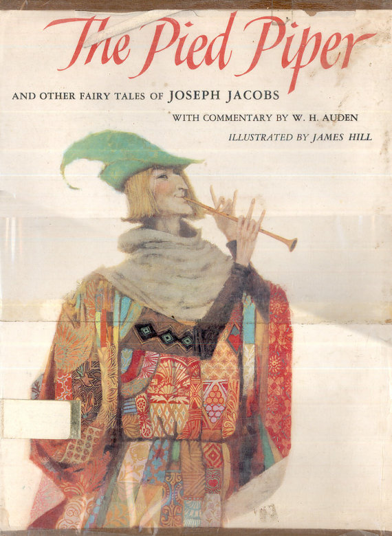 There are loads, but the one that jumped to my mind when I read this question is this gorgeous old book my mother bought us when we were small. It has a stylized Pied Piper on the cover and it’s called The Pied Piper and Other Stories. Although I loved the cover, I wasn’t wild about the Pied Piper story itself. It didn’t make any sense to me. But the book is a selection of the stories of Joseph Jacobs, the English Grimm, who went around recording stories heard by the hearth. It includes Childe Roland, the story of three brothers who are playing ball near a church and run around the church “widdershins” — the wrong way. Because of this they are taken away, and the only person who can get them back is their sister. Drawn as this sixties chick with bubble hairdo and empire-waisted dress, she looks dippy — but she outsmarts the ogre and rescues the boys. Tink would love it!